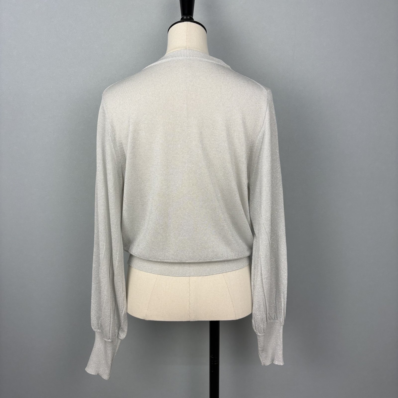 ラメ入りシルク混の糸で編立仕様。丈が短めのカーディガン。