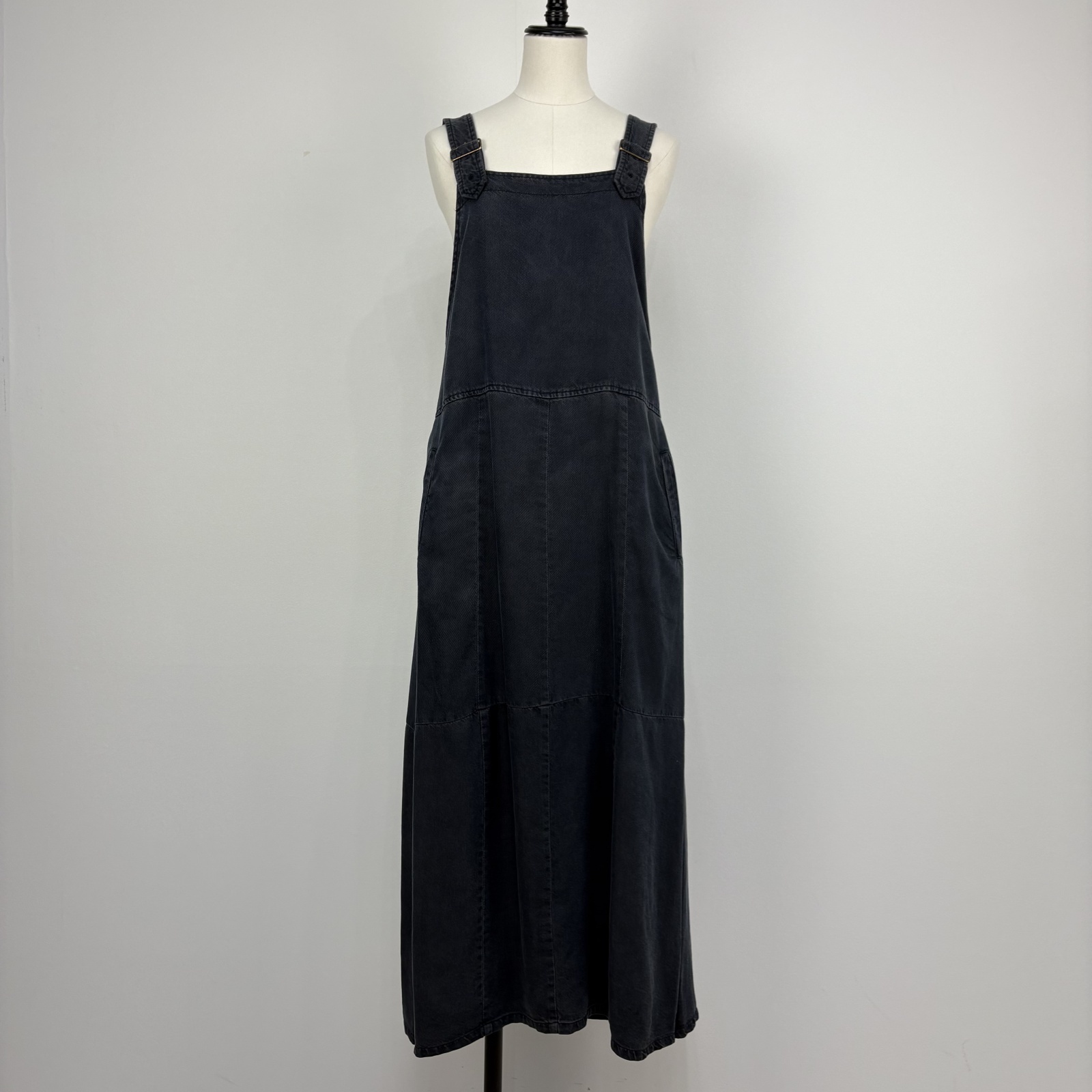 テンセルデニムで柔らか素材。肩に長さ調整付。ロングジャンパースカート。