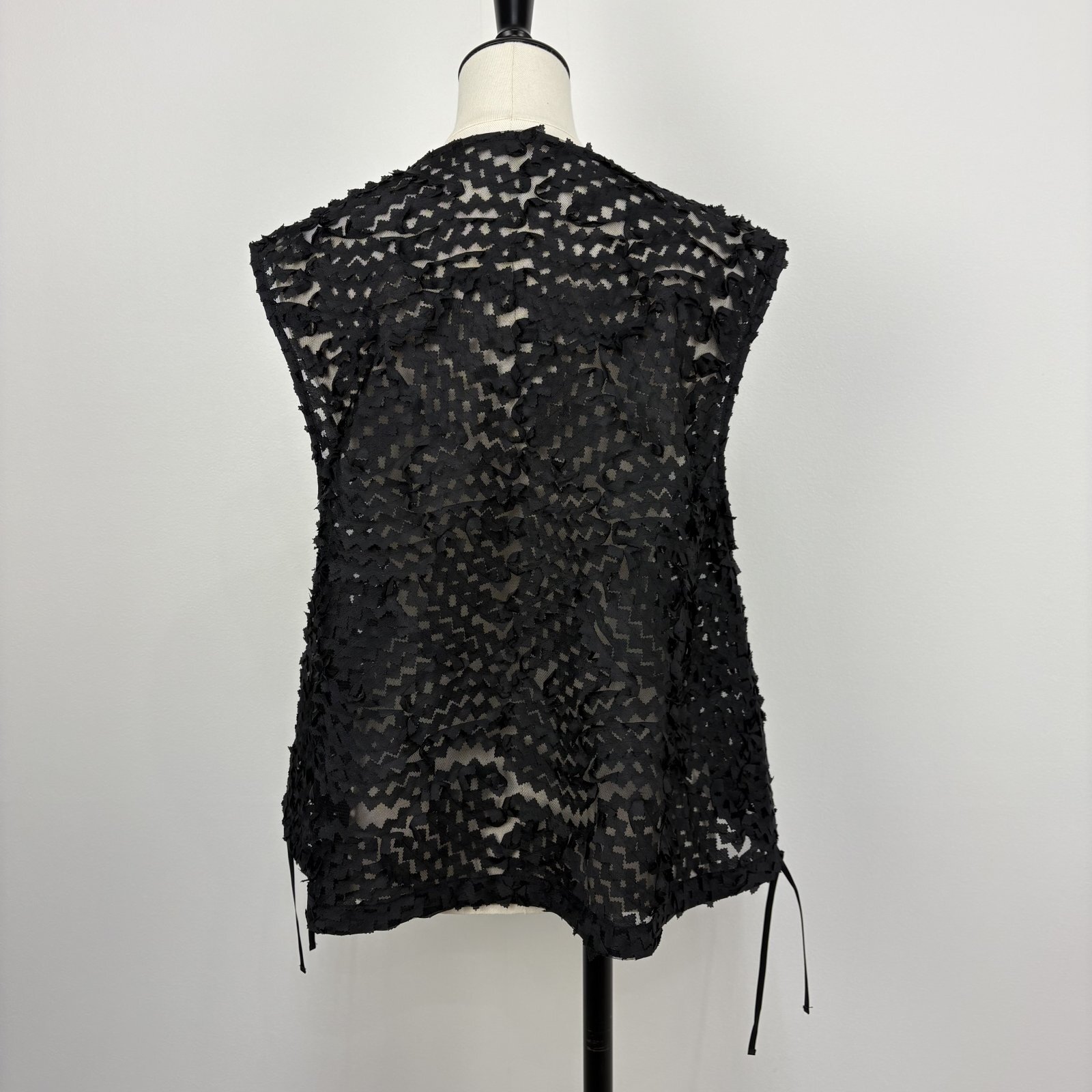 テープヤーン素材のレース風仕立てベスト。両脇に調整紐付き。透け感あり。